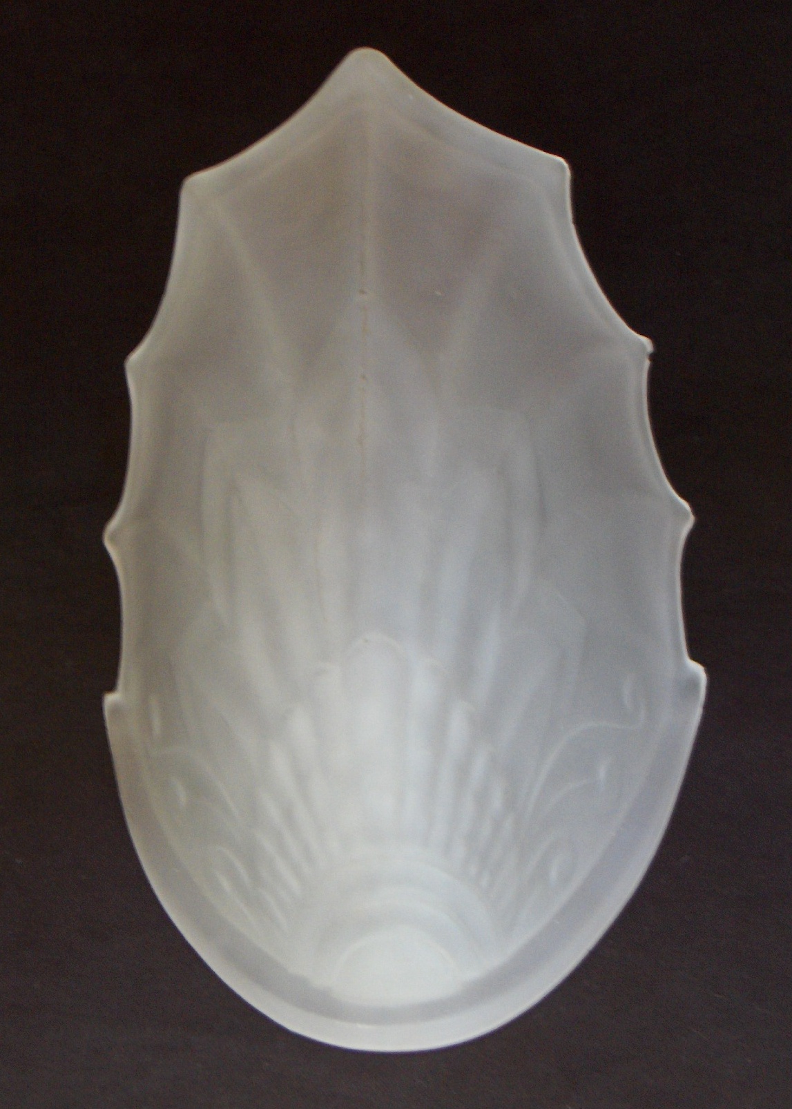 - This shade is white frosted and has Art Deco Styling. There is a leaf and fan relief along the lower part of the shade