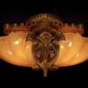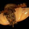 - This fixture has a bronze finish and features caramel iridescent shades which are in excellent condition with no cracks or chips.